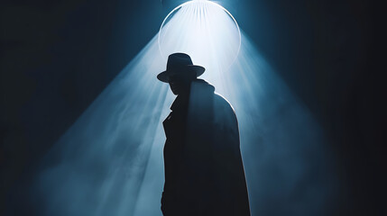 A dark silhouette of a male detective in a coat and hat in the noir style A dramatic portrait in the style of detective films of the 1950s The silhouette of a spy in a circle of light  : Generative AI