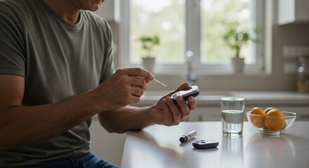 Mature man testing blood sugar with a glucometer at home. Diabetes self-management and daily health monitoring in a domestic setting.