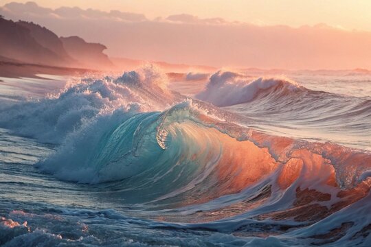 A stunning photograph of a large ocean wave crashing against the shore at sunset.