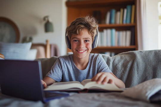 Happy Young Boy Studying at Home with Laptop and Headphones, Engaged in Online Learning