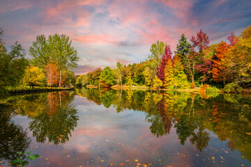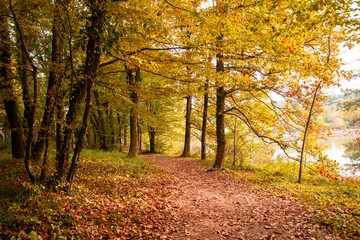 Beautiful autumn landscape. Colorful leaves falling from the tree in autumn. An empty bench by the tree and a view of the lake in the back. Istanbul, Turkey.