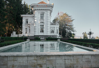 Mustafa Kemal Ataturk pavilion in trabzon. White building reflection on small pond of water.