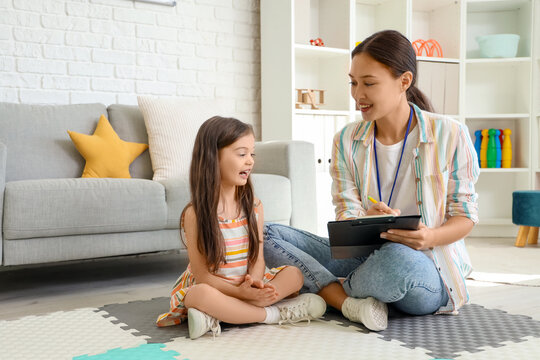 Female Asian speech therapist working with little girl in office