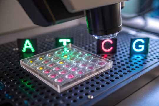 Next-Generation Sequencing Flow Cell Glass Surface Millions Wells Glowing Colored Clusters ATCG Nucleotides