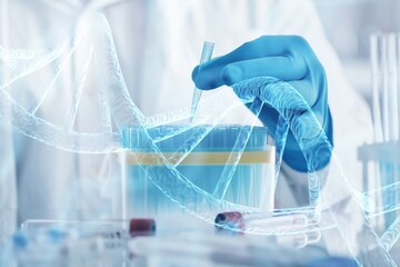 Hands of biomedical engineer genetic working whit microtubes in biotechincal laboratory. Scientist holding tube pcr in virtual screen with data scientific at genetic engineering lab
