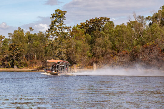 An Airboat Gliding Among Cypress Trees in the Atchafalaya Swamp, Louisiana