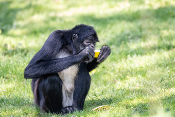 Black-handed spider monkey eating sweet yellow melon. Geoffroys spider monkey (Ateles geoffroyi) sitting on green grass with ripe juicy fruit in hands.