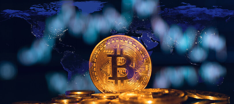 Bitcoin graphic or chart and world map concept. bitcoin or cryptocurrency trading worldwide. Global economy concept idea background. Elements of this image furnished by NASA.