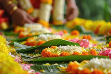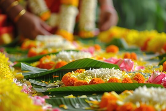 Festive joy: happy onam festival, marking harvest season,colorful rituals, grand feasts, intricate pookalam designs, joyful celebration of kerala's rich traditions, communal harmony.
