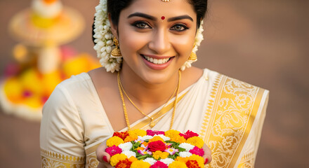 Onam Festivities: Woman in Kerala Saree with Pookalam