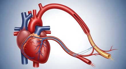 Illustration of a human heart with blood cells and plaque in a blood vessel
