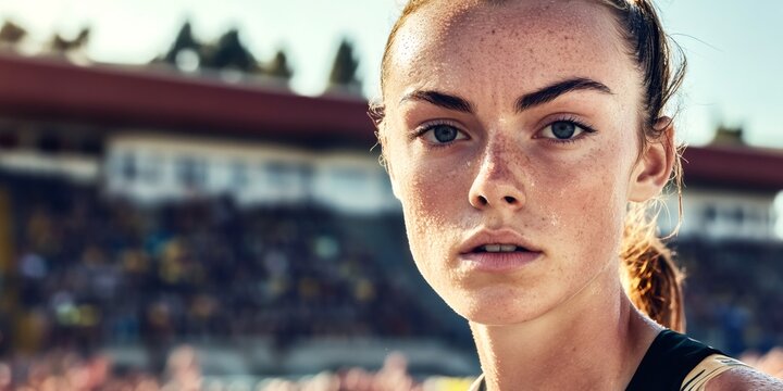 Determined female athlete resting, sweating, pausing after high intensity training at outdoor stadium track with focused expression