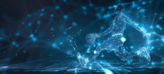 Futuristic illustration of a basketball player made of digital particles dunking in an abstract neon space. Concepts of sports, technology, and innovation in a dynamic visual style.