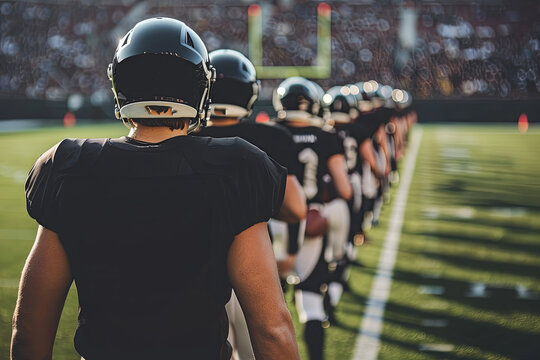 Rear view of Caucasian male athletes in American football uniforms, positioned on a stadium field, ready for a game or practice session