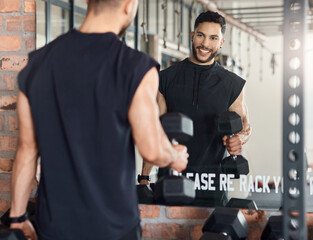 Workout to impress yourself. Shot of a sporty young man looking at himself in a mirror while exercising with dumbbells in a gym.