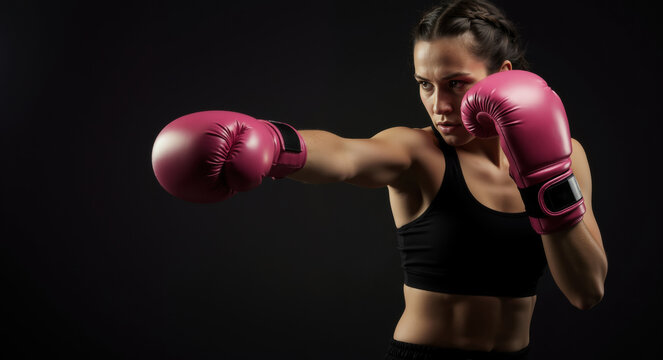 Woman in black sports bra throwing punch with pink boxing gloves against dark background. Combat sport and athletic training. Fitness concept for female boxing and strength conditioning