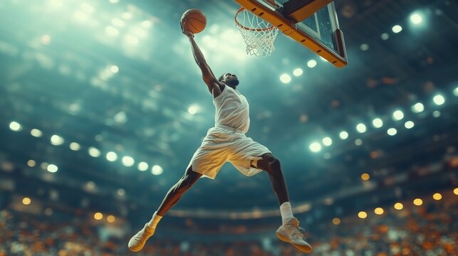 A basketball player making a slam dunk during a game, captured mid-air with powerful movement and focus, against a packed arena backdrop
