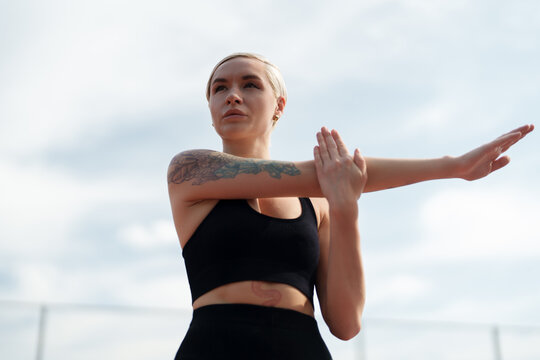 Fitness enthusiast performs arm stretches, focusing on her pre-workout routine against a cloudy sky