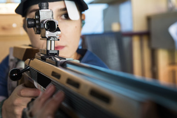 Young redhead caucasian woman on tactical gun training classes. Woman with weapon. Outdoor Shooting Range. Side view on beautiful lady with rifle machine gun in the forest, slim female is hunting