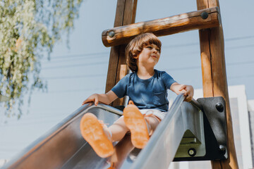 cheerful little boy in a blue T-shirt and white shorts rolls down a metal slide in city park. child walks outdoors. healthy active recreation. lifestyle. space for text. High quality photo