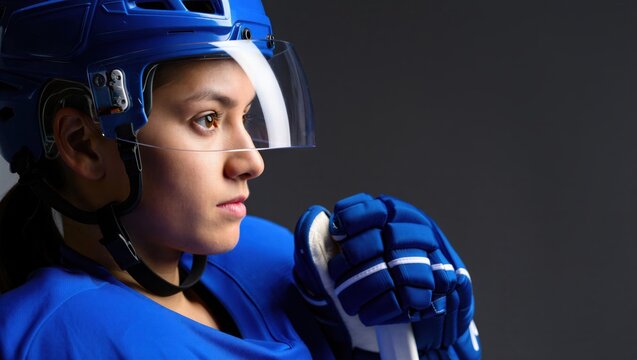 A female hockey player wearing a blue uniform and helmet, looking focused and determined. Sports and athleticism concept.
