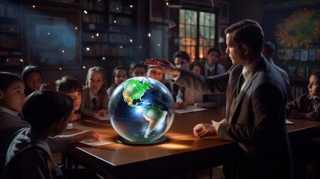 Vintage classroom scene with an open book and globe on a wooden desk, evoking nostalgia and timeless education.