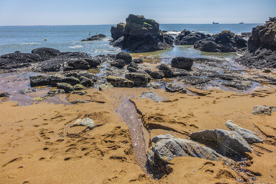 Atlantic Ocean and beach at Saint-Marc-Sur-Mer. Saint-Marc-sur-Mer - seaside resort in commune of Saint-Nazaire, department of Loire-Atlantique, region of Pays de la Loire, France.