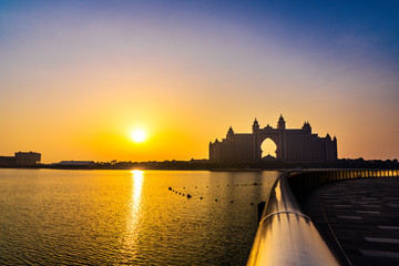 DUBAI / UNITED ARAB EMIRATES - MAY 2020: A landscape view of the  multi-million dollar Atlantis resort in Palm Jumeirah during golden hour.