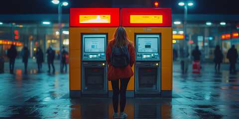 Tourists getting public transport tickets at a machine at a tram stop. young couple of male and female taking cash money from the bank atm machine.