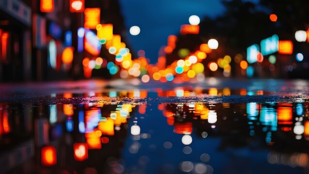 A stunning close-up shot capturing the vibrant city lights along a road at night. The blurred background adds a sense of depth and motion, creating a dynamic and atmospheric urban scene