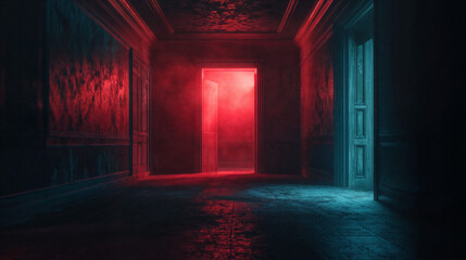 Dark, atmospheric corridor. A glowing red doorway contrasts with cool blue light, creating a mysterious, eerie, and suspenseful interior scene.