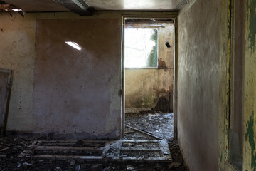 Dark, Foggy Corridor with Cracked Floor and Open Doorways.