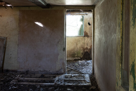 Mysterious open doorway with bright orange flames behind, casting eerie glow in dark, smoky, abandoned room filled with mystery