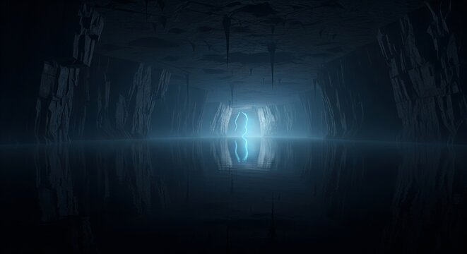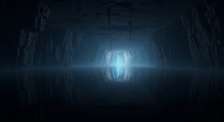 Mysterious glowing blue portal in a dark cave with reflective water and jagged stalactites creating an eerie atmospheric scene