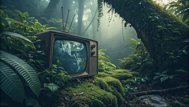 Vintage Television Set Displaying the Earth Found in a Dense Jungle