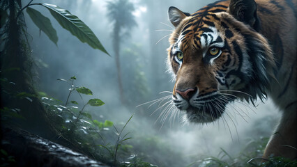 Hyper Detailed Close Up of a Fierce Orange and Black Tiger Emerging from a Misty Green Jungle Environment Showing Intense Eyes and Whiskers