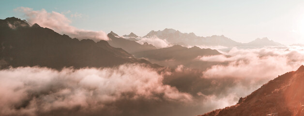 Backlit woman watching mountain peaks with binoculars, silhouette and lens flare bokeh