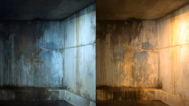 Grungy concrete corner with water stains and drips under cool blue and warm yellow lighting wall