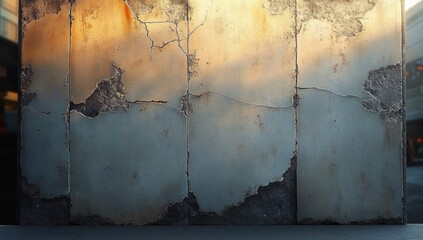 Weathered cracked concrete wall with peeling paint and rust stains bathed in warm golden light, evoking nostalgia and urban decay