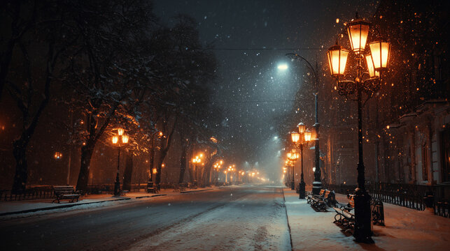 Snowy winter night street with vintage lamplights
