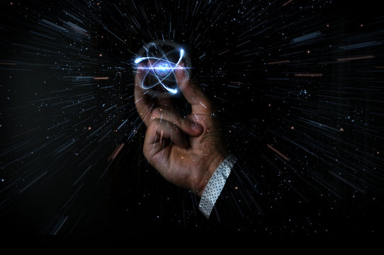Nucleus of Atom Nuclear explode atomic bomb red hot ray radiation blue light science illustration concept.