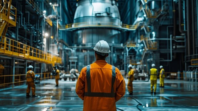 Nuclear engineer supervising fuel loading into reactor core with staff and cranes