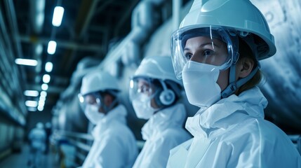 a group of nuclear engineers wearing protective suits and helmets safety protocols in nuclear operations