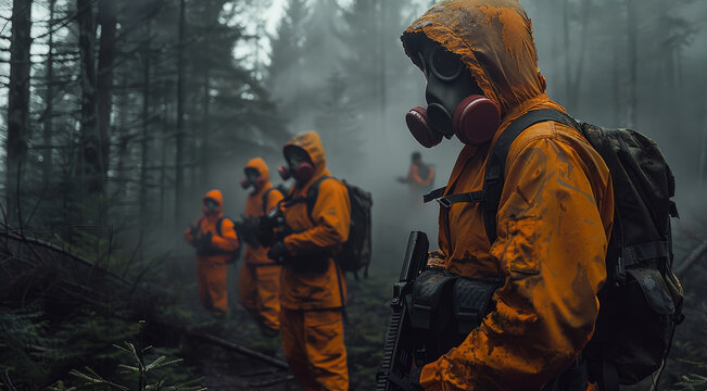 A group of soldiers in the forest wearing orange camouflage hoods and gas masks, red , carrying weapons. Generative AI.