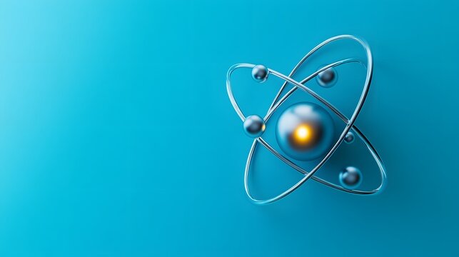 Realistic depiction of a metallic atom with orbiting electrons on a vibrant blue background