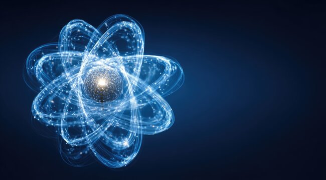 Abstract representation of atomic structure with glowing particles and blue light effects. Concept of science, technology, and energy.