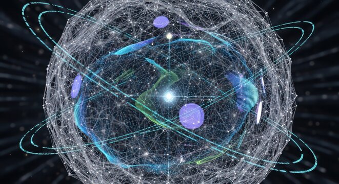 Stylized atomic structure with glowing nucleus and orbiting electrons inside transparent shell on cosmic background.