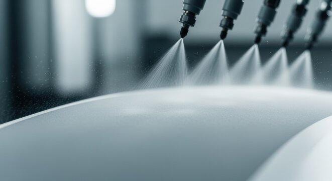 Heatshield ablative material being atomized through spray nozzles ensuring a smooth even layer for thermal protection during atmospheric reentry.
