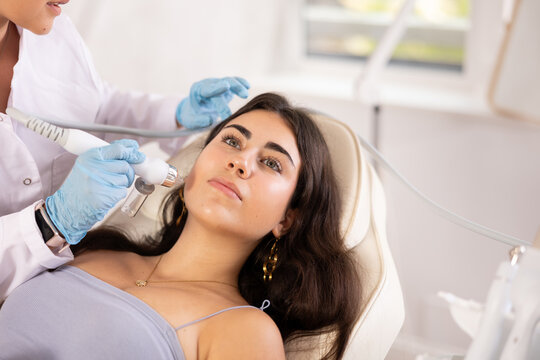 Young brunette undergoing facial procedure with application of atomized nutrients to enhance skin vitality at aesthetic medicine clinic. Modern technologies in hardware cosmetology