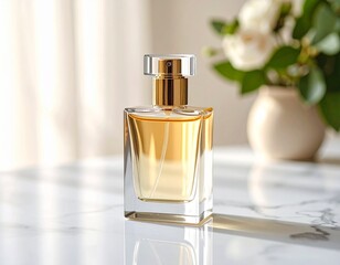 Luxury perfume bottle with transparent liquid spray and white cap for a fresh aroma